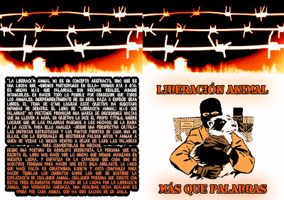 “La Liberación Animal no es un concepto abstracto, sino que es una lucha que -quienes participamos en ella- vivimos día a día. Es mucho más que palabras, son hechos reales, aunque intangibles. Es hacer todo lo posible por conseguir que todos los animales, independientemente de su sexo, raza o especie sean libres. El tema de cómo lograr este objetivo ha suscitado infinidad de debates. El libro de “Liberación Animal: más que palabras” no pretende provocar una marea de discusiones vacías que no lleven a nada. Su objetivo lo dice el propio título, quiere lograr que de las palabras pasemos a los hechos; de la rabia a la acción. Para ello analiza –desde una perspectiva crítica- las distintas estrategias y los puntos fuertes de cada una de ellas, con la esperanza de desterrar falsos mitos y animar a quien de veras lo sienta dentro a dejar de lado las palabras para convertirlas en hechos.Desde una postura en absoluto derrotista, la persona que ha escrito el libro nos hace ver lo mucho que hemos avanzado en nuestra lucha, y enfatiza en la capacidad que cada uno de nosotros tenemos para hacer que esto siga adelante. Lo único que hace falta es creatividad, ilusión y auto confianza para hacer temblar los cimientos sobre los que se sostiene la explotación de cualquier animal. Cualquier persona que cuente con estos tres elementos puede hacer de la lucha por la Liberación Animal una verdadera amenaza, una realidad. Dicha realidad es vivida por cada animal que ha sido sacado de su jaula."